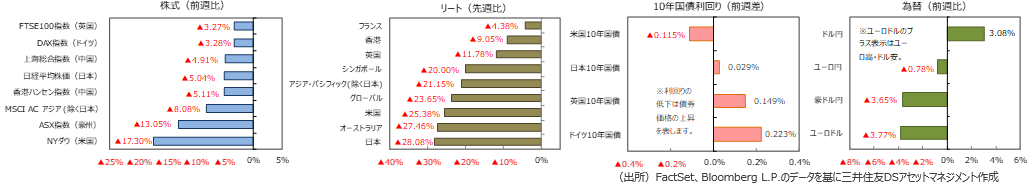 米国の10年国債利回りは、FRBの緊急利下げや、欧州や米国を中心とした新型コロナウイルスの感染拡大を受けて週間で0.115%低下しました。日本、ドイツ、英国の10年国債利回りは上昇しました。
