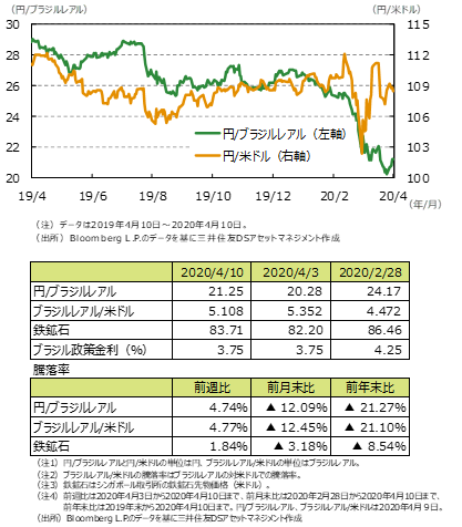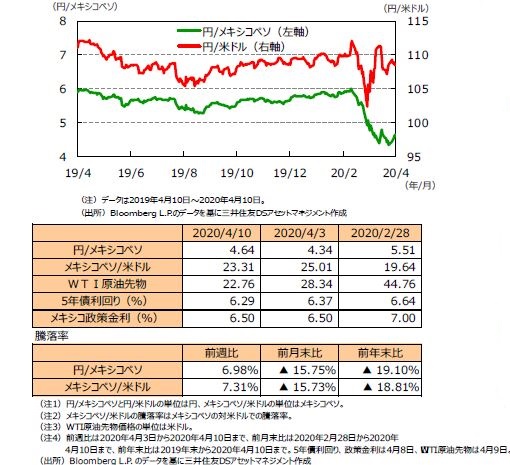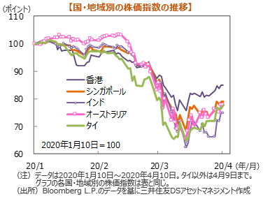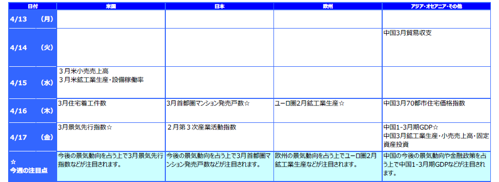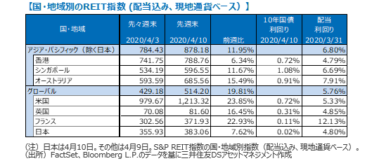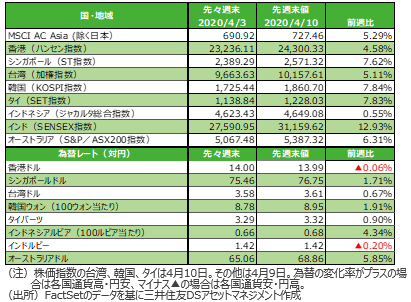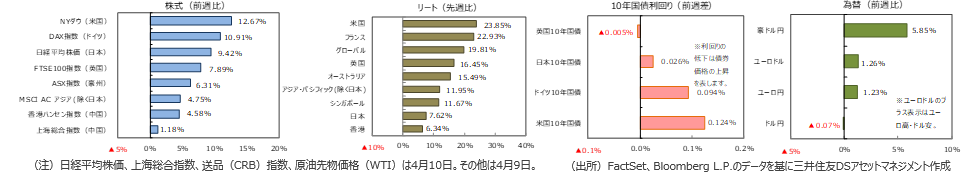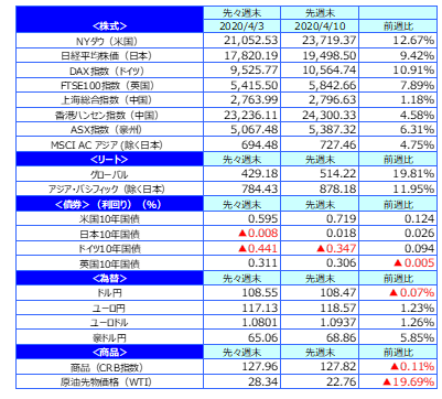 世界の株式市場は、欧米で新型コロナウイルスのピークアウト期待が高まったことや各国の積極的な金融政策や財政政策を背景に大幅に上昇しました。米国株式市場では、新型コロナウイルスの感染者数や死亡者数の増加ペースが鈍化し、ピークアウト期待が高まるなか、米連邦準備制度理事会(FRB)が低格付け社債の直接購入を含む2.3兆米ドルの流動性供給計画を示したことが好感されました。NYダウは、週間では12.67%上昇しました。日本株式市場は、世界的な株高や国内では7都府県に緊急事態宣言が発令され、感染拡大に歯止めがかかるとの期待が高まり、上昇しました。日経平均株価の週間上昇率は9.42%となりました。欧州株式市場では、新型コロナウイルスの感染者数や死亡者数の増加ペースの鈍化などを好感して上昇しました。DAX指数は10.91%、FTSE100指数は7.89%上昇しました。中国株式市場では、上海総合指数は1.18%、香港ハンセン指数は4.58%上昇しました。