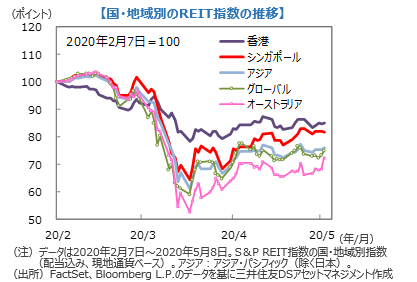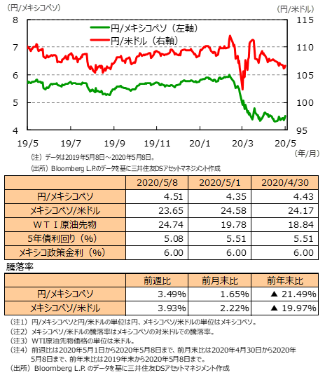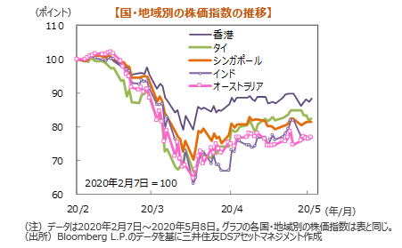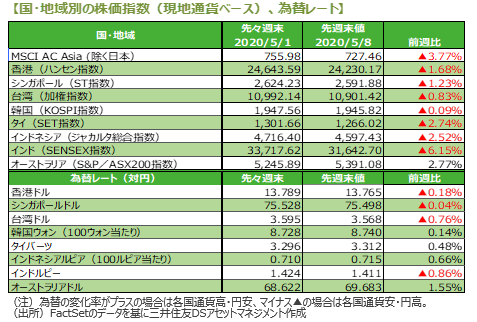 主要国の株式市場は、欧米で新型コロナ対策の都市封鎖が徐々に緩和され、経済活動の再開が始まっていることなどを背景に概ね上昇しました。米国株式市場は、経済活動の再開期待や米中関係悪化懸念が和らいだことなどを好感して上昇しました。米国の失業率は戦後最悪の水準まで悪化しましたが、特に悪材料視されませんでした。NYダウは2.56%上昇しました。日本株式市場は、2日間の取引となりましたが、欧米での段階的に経済活動を再開させる動きや米国でナスダック総合指数が昨年末の水準を回復したことなどを好感して、日経平均株価は20,000円を回復し、2.85%上昇しました。欧州株式市場では、段階的に経済活動を再開させる動きや中国の貿易統計などが好感され、DAX指数は0.39%上昇、FTSE100指数は3.00%上昇しました。中国株式市場は、米中対立が和らいだことなどを好感して、上海総合指数は1.23%上昇した一方、香港ハンセン指数は1.68%下落しました。