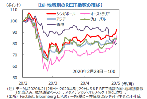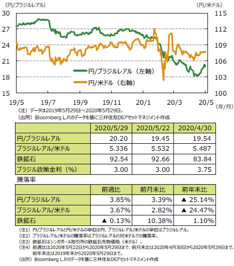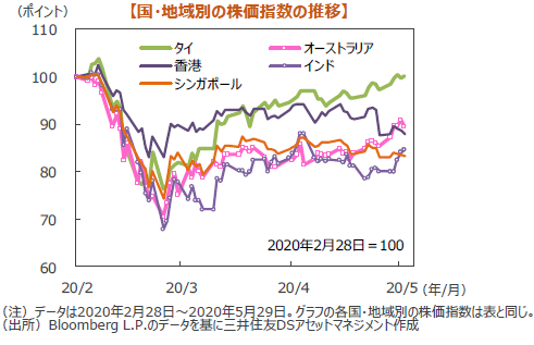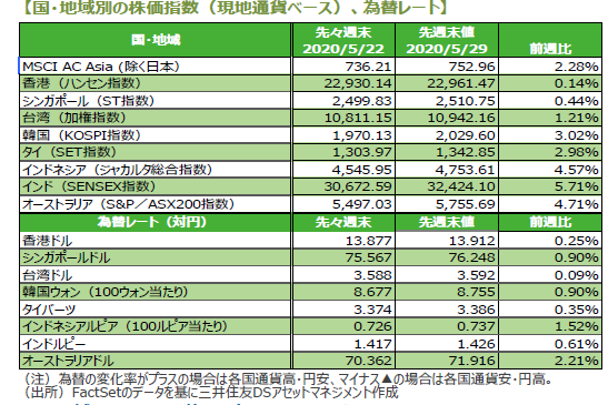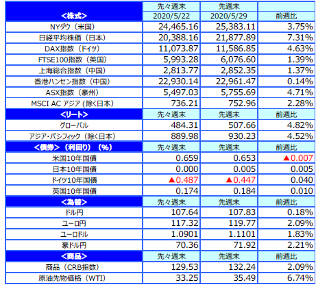 主要国の株式市場は、中国や先進国の経済活動再開の動きやワクチン開発期待などを背景に上昇しました。米国株式市場は、米中対立激化が懸念されましたが、全米で経済活動が段階的に再開し景気回復期待が高まったほか、コロナに対するワクチンの開発期待などを好感して、NYダウは3.75%上昇しました。日本株式市場は、国内での緊急事態宣言が解除されたことや米国株が上昇したことなどを好感して、日経平均株価は7.31%上昇しました。欧州株式市場は、経済活動の再開の動きや、欧州委員会が提示した復興基金が好感され、DAX指数は4.63%、FTSE100は1.39%上昇しました。中国株式市場は、「国家安全法」の香港への導入方針を受け、米中対立の激化懸念が強まりましたが、世界各地での経済活動の再開の動きや中国の景気対策期待が支えとなり、上海総合指数は1.37%上昇しました。香港ハンセン指数はほぼ横ばいとなりました。