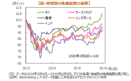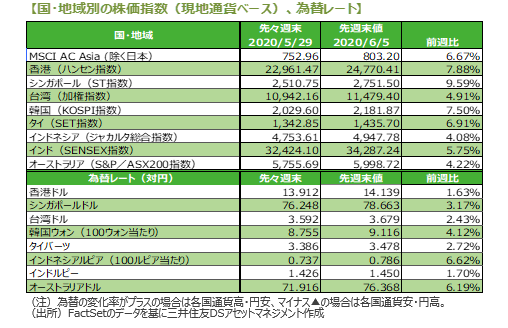 主要国の株式市場は、中国や先進国の経済活動再開の動きや経済指標の改善などを背景に大幅に上昇しました。米国株式市場は、全米で経済活動が段階的に再開するなか5日発表の5月雇用統計は、非農業部門雇用者数、失業率とも事前予想を大幅に上回る改善となり景気回復期待が高まりました。NYダウは6.81%上昇しました。日本株式市場は、米国株高や円安進行が支援材料となり、日経平均株価は4.51%上昇しました。欧州株式市場は、米中などの経済指標の改善やドイツの追加経済対策への期待などから、DAX指数は10.88%、FTSE100は6.71%上昇しました。中国株式市場は、トランプ米大統領が中国との貿易合意の破棄や制裁関税に言及せず、香港への優遇措置の見直しも想定内だったことから米中対立への警戒感が後退したことや、PMIの改善で景気回復期待が高まったことなどから、上海総合指数は2.75%,香港ハンセン指数は7.88%上昇しました。