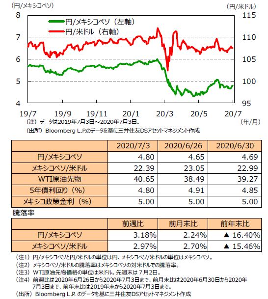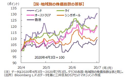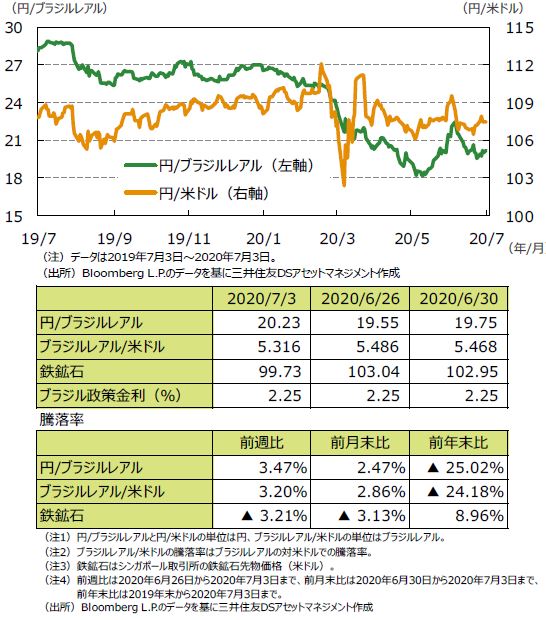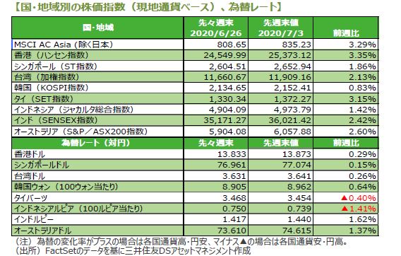 主要株式市場はおおむね堅調に推移しました。米国や新興国で新型コロナウイルスの感染拡大が続きましたが、主要国の経済指標が景気回復を示したこと等が好感されました。米国株式市場は、南部を中心に新型コロナの感染が拡大しているものの、ワクチン開発のニュースや良好な雇用統計、半導体企業の好業績等が好感されました。NYダウは週間では3.25%上昇しました。日本株式市場は、国内での新型コロナの感染者数の増加を受けて経済等への懸念が高まり、日経平均株価は週間では0.91%下落しました。欧州株式市場は、米国市場の上昇に連れて概ね上昇しました。DAX指数は3.63%上昇。FTSE100はほぼ横ばいの▲0.03%でした。中国株式市場は、企業景況感指数が大きく改善した他、人民銀行が再貸出し金利の引き下げを行ったことなどを好感して上昇しました。香港国家安全法が施行され、7月1日には多数の逮捕者が出ましたが、相場への影響は限定的でした。上海総合指数は5.82%上昇、香港ハンセン指数は3.35%上昇しました。