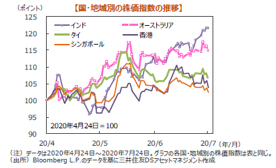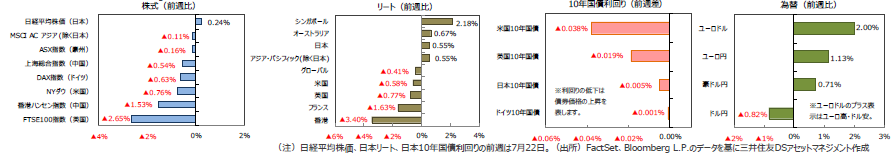 主要株式市場はおおむね小幅ながら下落しました。米国株式市場は、週前半は新型コロナウイルスの感染拡大が続いたものの、ワクチンや治療薬開発のニュースが相次いだことなどから堅調に推移しました。後半は米国がテキサス州の中国総領事館の閉鎖を求めたことに対抗して中国が四川省の米国総領事館を閉鎖すると通知し、米中対立激化懸念が強まったことなどから下落しました。NYダウは週間では0.76%下落しました。日本株式市場は、月曜、火曜、水曜日の3日間取引となり、週前半の米国株高などを受けて、日経平均株価は0.24%上昇しました。欧州株式市場は、新型コロナウイルスの感染再拡大や、米中対立激化懸念などから下落しました。DAX指数は0.63%、FTSE100は2.65%下落しました。中国株式市場は、米国がテキサス州の中国総領事館の閉鎖を発表すると中国も対抗措置を発動したことから、米中関係の悪化を嫌気して上海総合指数は0.54%、香港ハンセン指数は1.53%下落しました。