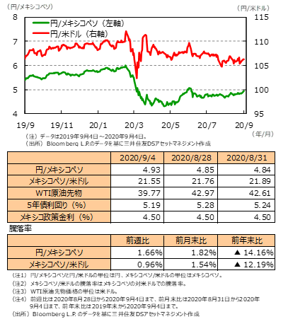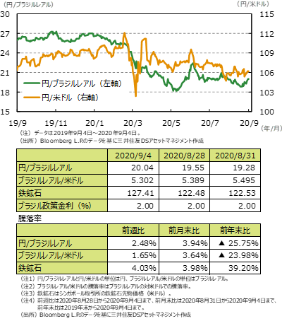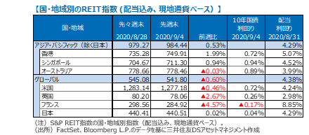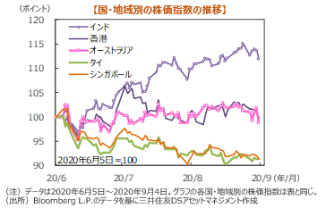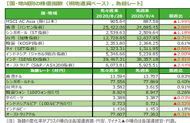 主要株式市場は、日本株を除き下落しました。米国株式市場は、2日まではS&P500とナスダック総合が史上最高値を更新するなど堅調な展開となりましたが、週後半に主力ハイテク株に対する高値警戒感が強まり、大幅に下落しました。NYダウは週間では1.82%下落しました。日本株式市場は、自民党総裁選への出馬が伝わった菅官房長官が優勢との見方が強まり、政局に対する不透明感が後退したことや、米著名投資会社の株式取得が明らかとなった商社大手5社が急伸したことなどから日経平均株価は1.41%上昇しました。欧州株式市場は、米国株の急落や軟調な経済指標などを受けてDAX指数は1.46%、FTSE100指数は2.76%下落しました。中国株式市場は、インドや米国との対立激化への警戒感などから、上海総合指数は1.42%、香港ハンセン指数は2.86%下落しました。