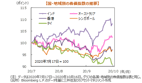 主要株式市場はまちまちとなりました。米国株式市場は、コロナワクチン開発の先行きに不透明感が強まったことや、追加経済対策の成立の遅れが嫌気されました。一方で米9月小売売上高の上振れなどは好感されました。NYダウは週間では0.07%上昇しました。日本株式市場は、円高に加えて、新型コロナワクチンの治験中断の報道や米国の追加経済対策を巡る不透明感などが嫌気されました。ただ下値を売る動きも限られ小幅の下落となりました。週間では0.89%下落しました。欧州株式市場は、英国とEUの貿易協定の先行き不安や、新型コロナ感染拡大への警戒感などを背景に下落しました。DAX指数は1.09%、FTSE100指数は1.61%下落しました。中国株式市場は、深セン経済特区の創設40周年に合わせて習近平国家主席が記念式典に出席することが伝わり、地域振興策や政策への期待が相場を支える展開となりました。上海総合指数は1.96%、香港ハンセン指数は1.11%上昇しました。