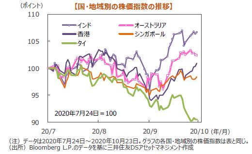 主要株式市場はまちまちながらやや軟調な展開となりました。米国株式市場では、依然として混戦が続く米大統領選挙が、追加経済対策協議、再び増加する新型コロナウイルス新規感染者等と共に相場の不透明材料となりました。7-9月期の企業業績は太宗が事前予想を上回る良好なものですが、株式市場は軟調で、NYダウは週間では0.95%下落しました。日本株式市場は、円高が進みましたが、輸出の改善などを受けて底堅く推移し、週間では0.45%上昇しました。欧州株式市場は、英国と欧州連合(EU)の貿易協定交渉が続く中、新型コロナ感染急拡大を受けて下落しました。DAX指数は2.04%、FTSE100指数は1.00%下落しました。中国株式市場は、まちまちな動きとなり、上海総合指数は1.75%下落、香港ハンセン指数は2.18%上昇しました。発表された7-9月期GDP成長率は前年比4.9%成長で、順調な景気回復が続いている点が確認されました。