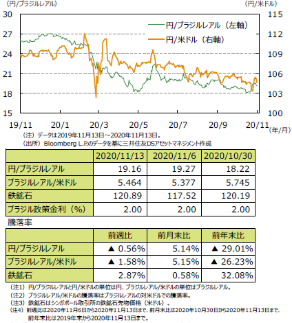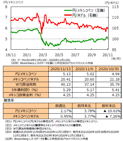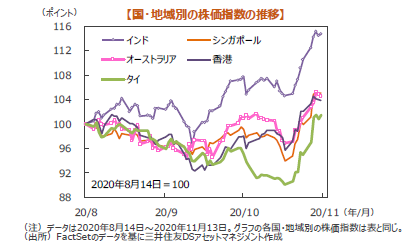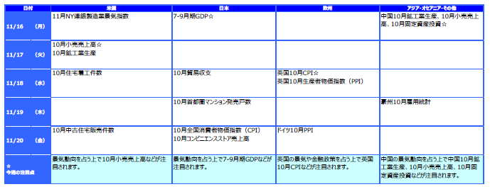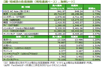 主要株式市場は新型コロナワクチンへの期待などを背景に大部分の市場で上昇しました。米国株式市場は、米国で新規コロナ感染者数が過去最高の更新が続いたことなどは嫌気されましたが、バイデン氏の大統領選勝利が報じられたことや米製薬大手が新型コロナワクチンの有効性が90%以上と示したことが伝わり、経済活動正常化期待から景気敏感株を中心にNYダウは時間中に9カ月ぶりに史上最高値を更新しました。NYダウは週間では4.08%上昇しました。日本株式市場は、米国でバイデン氏の大統領選勝利が報じられたことや新型コロナワクチンへの期待などから、週間では4.36%上昇しました。欧州株式市場は、新型コロナワクチン開発の進展や米大統領選でのバイデン氏の勝利などが好感され、DAX指数は4.78%、FTSE100指数は6.88%上昇しました。中国株式市場は、米大統領選でバイデン氏の勝利がほぼ確実になったことは好感されましたが、物価統計や金融統計が市場予想を下回ったことなどが嫌気され上海総合指数はほぼ横ばい、香港ハンセン指数は1.73%上昇しました。