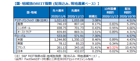 グローバル・リートは、欧米での株式市場の大幅上昇などを好感して7.30%上昇しました。