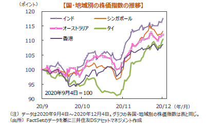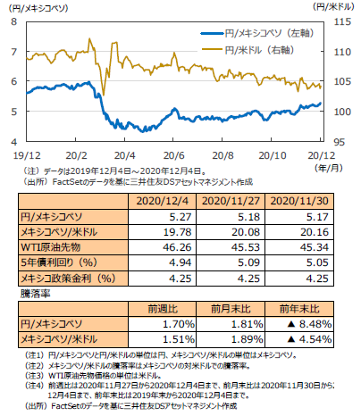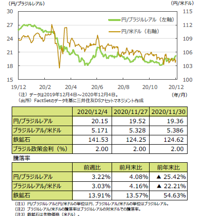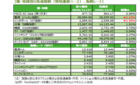 主要株式市場は概ね上昇しました。米国株式市場は、11月雇用統計で非農業部門雇用者数が市場予想を下回るなど経済指標は弱いものの、コロナワクチン普及による経済活動正常化期待や追加経済対策への期待の高まりなどを背景にNYダウは史上最高値を更新しました。週間ではNYダウは1.03%上昇しました。日本株式市場は、コロナワクチン開発の進展などを背景に米国株が上昇したことなどは好感されましたが、高値警戒感や週末の米雇用統計を前に様子見姿勢が強まり、日経平均株価は小幅な上昇となりました。週間では0.40%上昇しました。欧州株式市場は、英政府が米製薬大手の開発したコロナワクチンの使用を世界で初めて認めたことなどが好感され、FTSE100指数は2.87%上昇しました。DAX指数はドイツ政府がレストランやホテルの事業規制を延長すると伝わり、0.28%下落しました。中国株式市場は、11月の製造業PMIなどが良好な結果となり、景気の順調な回復が好感され上海総合指数は1.06%上昇しました。香港ハンセン指数は0.22%下落しました。