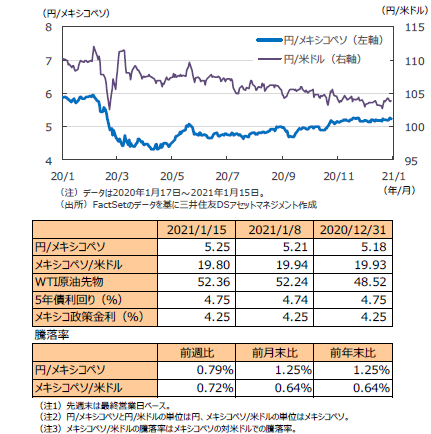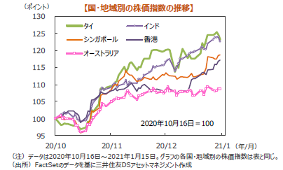 主要株式市場はまちまちの動きとなりました。米国株式市場は高値警戒感が強まる中、バイデン次期大統領が1.9兆ドル規模の経済対策案を発表しましたが、市場には織り込み済みで、材料出尽くし感などから下落しました。週間ではNYダウは0.91%下落しました。日本株式市場は、高値警戒感は強いものの米国における大規模な経済政策への期待などを背景に上昇しました。週間では日経平均株価は1.35%上昇しました。欧州株式市場は、イタリアの政局混迷懸念や英国、ドイツで新型コロナ収束の方向がみえないことに加えて、中国でも感染者数が急増したことなどを受け、DAX指数は1.86%下落しました。FTSE100指数は2.00%下落しました。中国株式市場は、河北省を中心に新型コロナの感染が拡大したことなどを嫌気して上海総合指数は0.10%下落しました。香港ハンセン指数は世界的な低金利環境の継続や中国の経済回復見通しなどを受けて2.50%上昇しました。