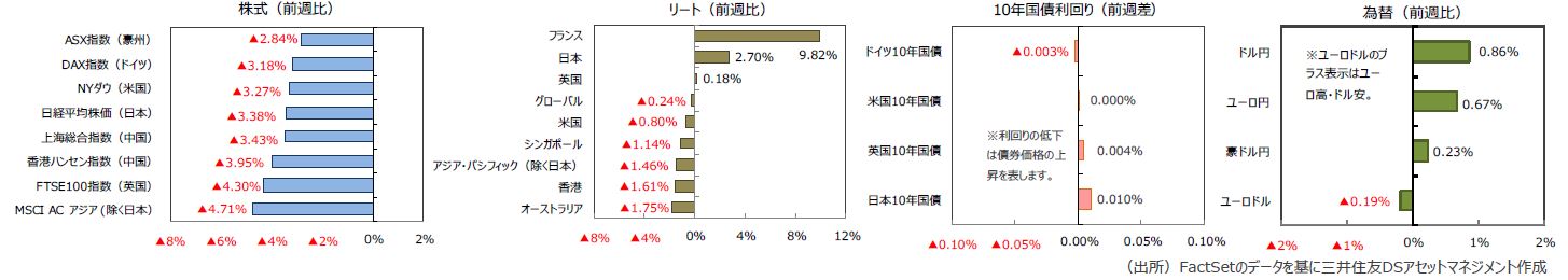 米国の債券市場は、株式市場が大幅に下落しましたが、先行きの景気回復や金融緩和政策の正常化への思惑が残り、週間では10年債金利は横ばいとなりました。日本、ドイツ、英国の長期金利もほぼ横ばいとなりました。
