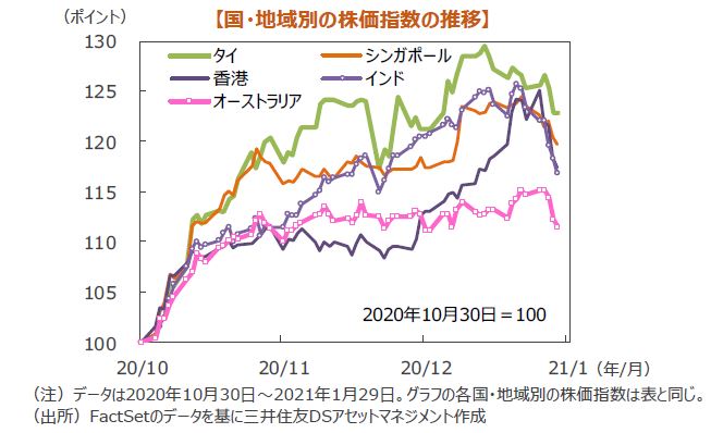 主要株式市場は米国での市場混乱や中国での短期金利急上昇などの影響から下落しました。米国株式市場は高値警戒感が強まる中、個人投資家の投機的な買いが集中した一部銘柄が急騰し、ショートポジションを持つヘッジファンドの破綻懸念が高まったほか、ボラティリティの急上昇もリスク回避の動きを強めました。NYダウは30,000ドルの大台を割り込み、週間では3.27%下落しました。日本株式市場は、日米企業の決算は概ね良好ですが、米国で投機的な売買が全体市場を混乱させ米国株が下落したことなどから、警戒感が高まり日経平均株価は28,000円を下回りました。週間では日経平均株価は3.38%下落しました。欧州株式市場は、封鎖措置が延長されたことや、ワクチンの接種遅延などを嫌気して、DAX指数は3.18%、FTSE100指数は4.30%下落しました。中国株式市場は、国内の短期金利急上昇や米国株の急落などが嫌気され、上海総合指数は3.43%、香港ハンセン指数は3.95%下落しました。