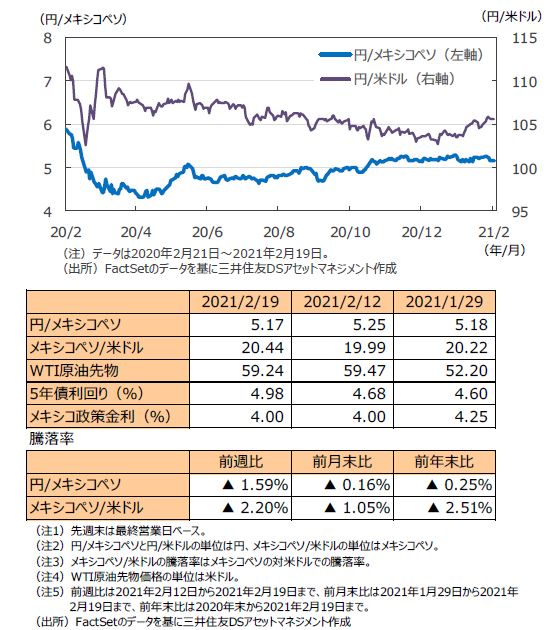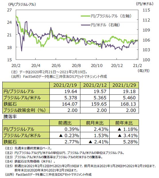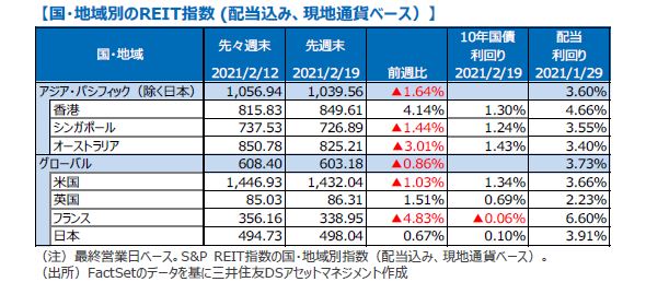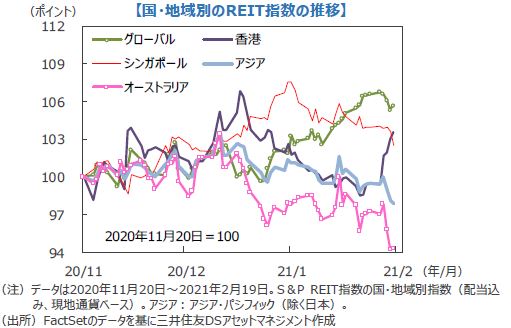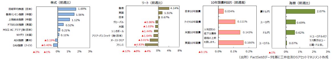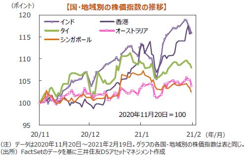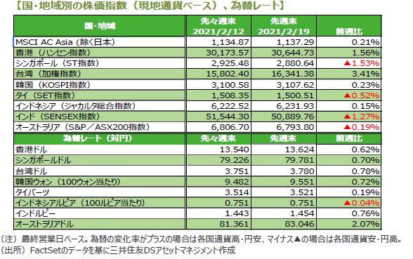 主要株式市場はまちまちとなりました。米国株式市場は追加経済対策期待が続いたほか、コロナワクチン接種の進展による景気回復期待などが株価上昇要因となりました。一方長期金利の上昇が続き、インフレリスクが懸念されたことなどから、NYダウは週間では0.11%と小幅の上昇となりました。日本株式市場は、主要企業の業績改善や、米国における追加経済対策、ワクチン普及による景気回復期待などを背景に、日経平均は約30年半ぶりとなる3万円を上回りました。しかし、以降は急ピッチな上昇に伴う高値警戒感が強まり、伸び悩みました。週間では日経平均株価は1.69%上昇しました。欧州株式市場は、FTSE100指数は商品市況の上昇を背景に資源株が上昇したことなどから0.52%上昇しました。DAX指数は0.40%下落しました。中国株式市場は、上海総合指数は旧正月の連休だったため2日間の取引でしたが、米国での追加経済対策期待などから1.12%、香港ハンセン指数は4日間の取引でしたが1.56%上昇しました。