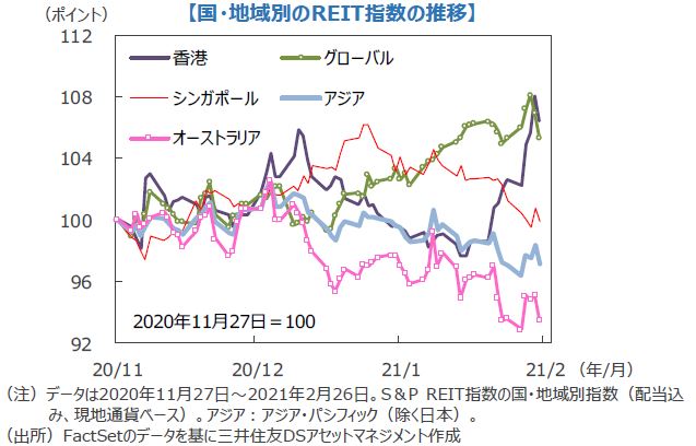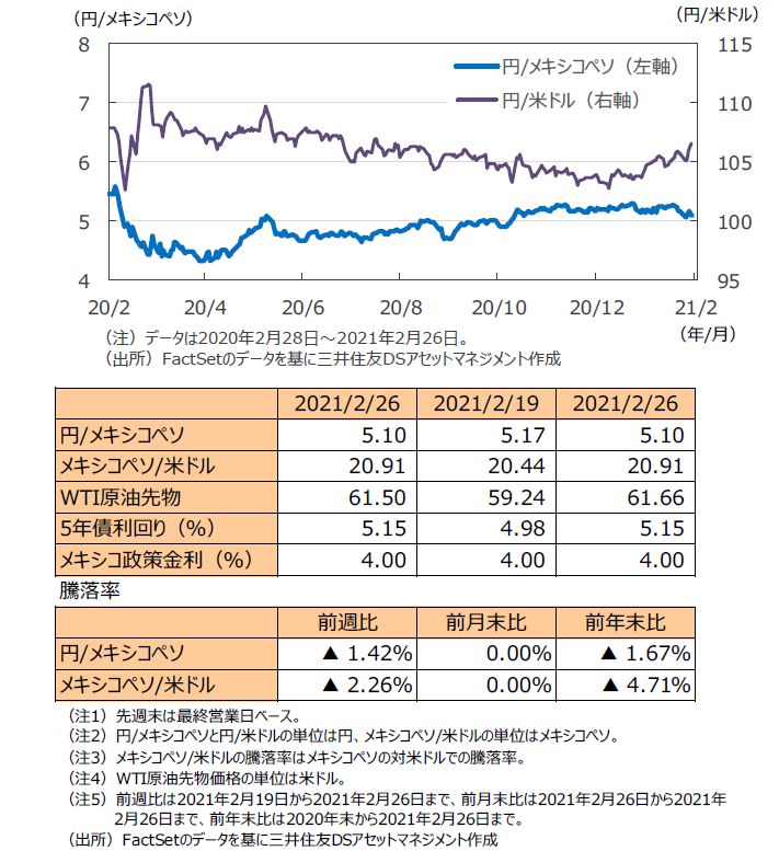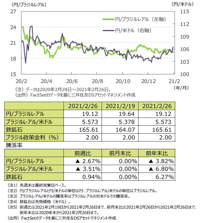 主要株式市場は米国の長期金利上昇などを嫌気して下落しました。米国株式市場は1.9兆ドルの追加景気対策法案の成立期待やワクチン接種進展による景気回復期待に加え、パウエル米連邦準備制度理事会(FRB)議長が緩和的金融政策の長期継続を示唆したことで堅調に推移しましたが、インフレや国債増発などが懸念され、長期金利の急上昇を受けて下落しました。NYダウは週間では1.78%下落しました。日本株式市場は、米国市場でグロース株が大きく売られたことや米10年債利回りが1.6%台をつけるなど金利上昇が加速したことなどから下落しました。26日には日経平均株価は1,202.26円と大幅な下落となり、週間では日経平均株価は3.50%下落しました。欧州株式市場は、米国における追加経済対策を背景とした物価や金利上昇に向けた懸念の高まりなどを嫌気してDAX指数は1.48%、FTSE100指数は2.12%下落しました。中国株式市場は、米長期金利の上昇や香港での株取引の印紙税引き上げ案を受け、上海総合指数は5.06%、香港ハンセン指数は5.43%下落しました。