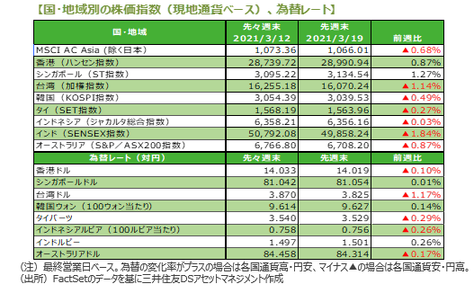 主要株式市場はまちまちとなりました。米国株式市場は、追加景気対策やコロナワクチン接種の進展などから景気の早期回復期待は強いものの、長期金利の上昇や米連邦準備制度理事会(FRB)が大手銀の資本規制の緩和措置終了を発表したことなどが嫌気されました。週間ではNYダウは0.46%下落しました。日本株式市場は、米国での追加景気対策などによる景気の早期回復期待を背景に堅調に推移しました。ただ週末は日銀の金融政策決定会合でのETF買い入れをTOPIX連動型のみにするとの発表を受け日経平均株価は大幅に下落し、週間では0.25%の上昇にとどまりました。欧州株式市場は、独DAX指数は米追加経済対策による景気回復期待などを背景に0.82%上昇しました。英FTSE100指数は原油安などを受けて0.78%下落しました。中国株式市場は、米中外交トップ会談での非難の応酬を受けて投資家心理が悪化し、上海総合指数が1.40%下落しました。香港ハンセン指数は米連邦公開市場委員会(FOMC)で金融緩和の長期化姿勢を示したことなどを好感して0.87%上昇しました。