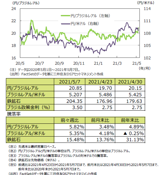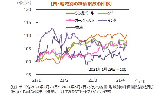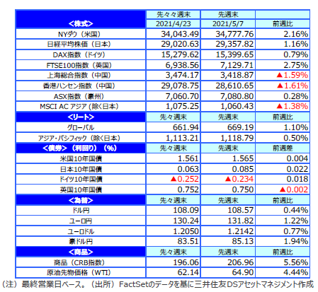 主要株式市場は中国市場などを除いて概ね上昇しました。米国株式市場は、新型コロナワクチン接種の進展や良好な企業決算発表などが好感され、景気敏感株などが上昇しました。一方、ハイテク・グロース株には利益確定売りが続きました。4月雇用統計は大きく下振れましたが、超緩和的な金融政策の長期化期待が支援材料となりNYダウは最高値を更新しました。先週末のNYダウは2週間前比で2.16%上昇しました。日本株式市場は、世界的な景気回復への期待や総じて良好な国内での決算発表などを受けて、市況関連や金融株など景気敏感セクター中心に上昇しました。日経平均株価は1.16%上昇しました。欧州株式市場は、新型コロナワクチン普及による経済正常化への期待が高まったことや、強い経済指標などを好感して、独DAX指数は0.79%、英FTSE100指数は2.75%上昇しました。中国株式市場は、高値警戒感に加えて新興国の新型コロナの感染拡大が警戒されたことなどから上海総合指数は1.59%。香港ハンセン指数は1.61%下落しました。