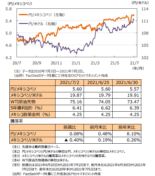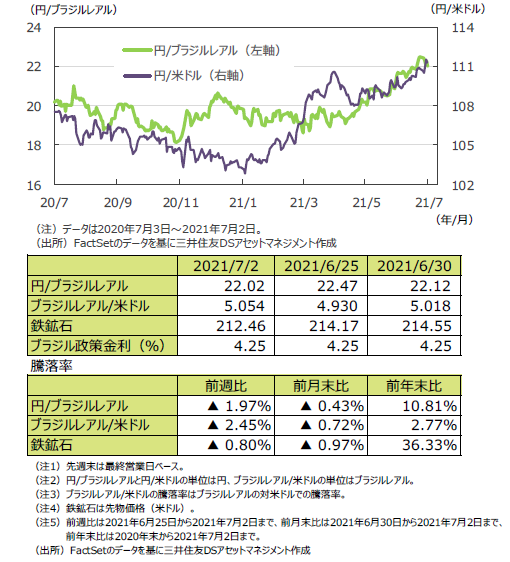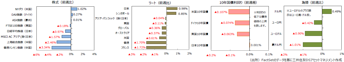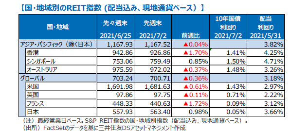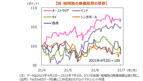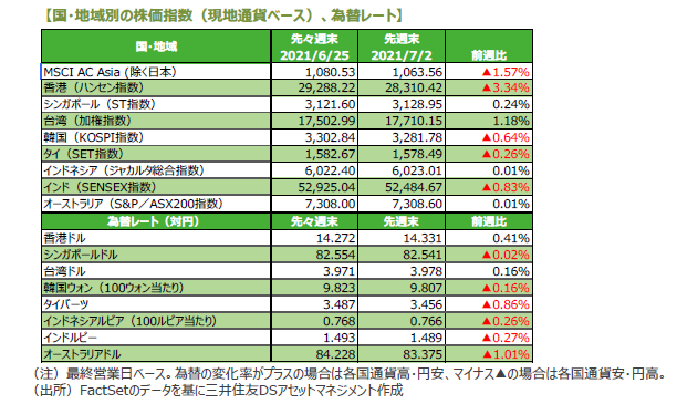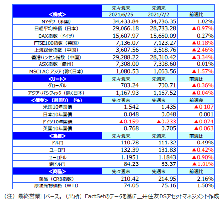 世界の主要株式市場は高安まちまちとなりました。米国株式市場では、長期金利の低下を追い風にグロース株がおおむね堅調に推移したほか、米6月雇用統計が強弱まちまちとなったことで、早期テーパリング(資産購入の段階的縮小)開始への懸念が和らいだことも支援材料となり、NYダウは最高値を更新しました。週間では、1.02%上昇しました。日本株式市場は、円安や米国株高は好感されましたが、新型コロナの新規感染拡大やワクチン接種の混乱などを嫌気して下落しました。日経平均株価は0.97%下落しました。欧州株式市場では、独DAX指数は6月独製造業PMI改定値が予想を上回ったことなどが好感され0.27%と小幅に上昇しました。英国では新型コロナの新規感染者数の増加などが嫌気され、英FTSE100指数は0.18%と小幅に下落しました。中国株式市場では、上海総合指数は財新製造業PMIの発表を受けて中国の景気の先行きに対して不透明感が強まり2.46%下落、香港ハンセン指数は3.34%下落しました。