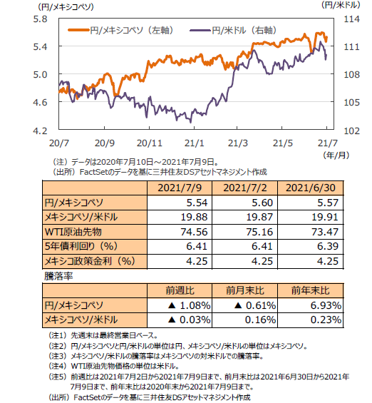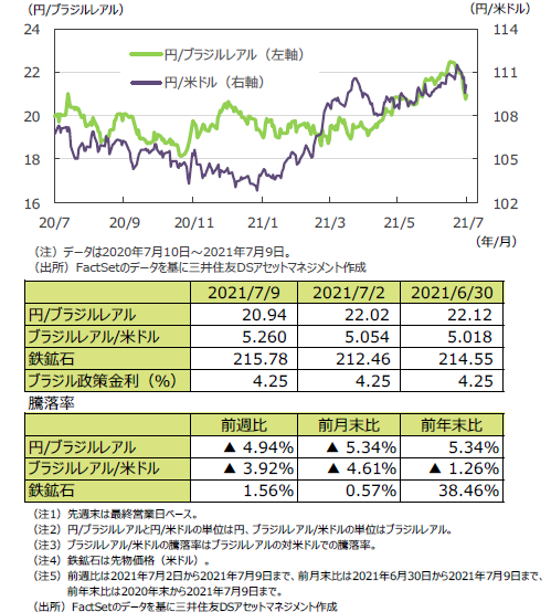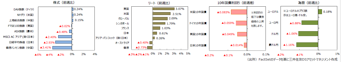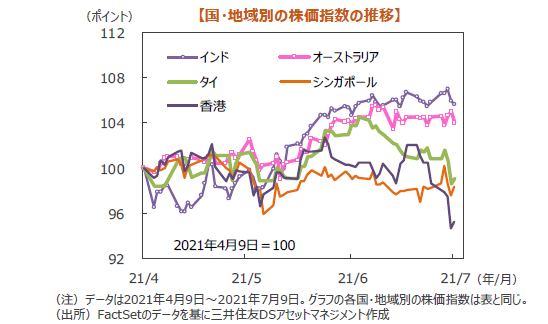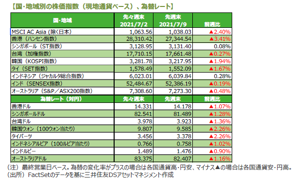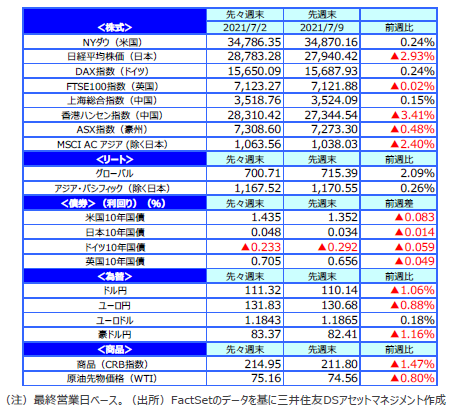 世界の主要株式市場はまちまちながらやや軟調な展開となりました。米国株式市場は軟調に推移していましたが、週末に大幅高となりNYダウは最高値を更新しました。米長期金利の低下が一服し、投資家心理が上向きました。週間では、0.24%上昇しました。日本株式市場は、新型コロナの新規感染拡大やワクチン接種の混乱に加えて、東京都議選で自民党の議席獲得数が予想を下回ったことなどを嫌気して下落しました。日経平均株価は2.93%下落しました。欧州株式市場では、欧州の景気拡大期待はあるものの、新型コロナの新規感染者数の増加などが嫌気され、独DAX指数、英FTSE100指数はともにほぼ横ばいとなりました。中国株式市場では、上海総合指数は新型コロナウイルス感染の再拡大を背景に世界景気の回復遅れへの懸念が強まり0.48%下落、香港ハンセン指数は中国当局がネット大手に対する規制を強めており、事業環境の不透明感を意識した売りが続き、3.41%下落しました。