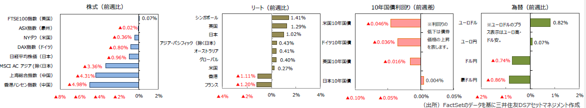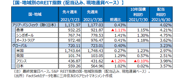 米国の10年物国債利回りはデルタ型の感染拡大で、世界経済の先行き懸念が強まり、週間では0.046%低下しました。ドイツ、英国の10年国債利回りも低下しました。