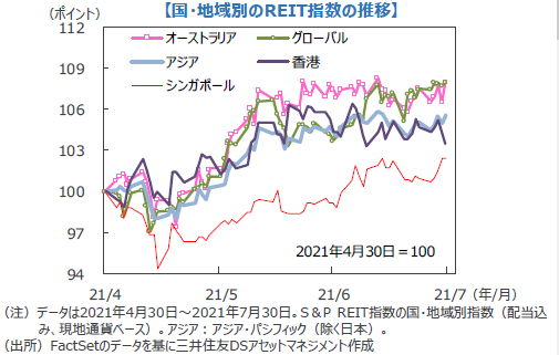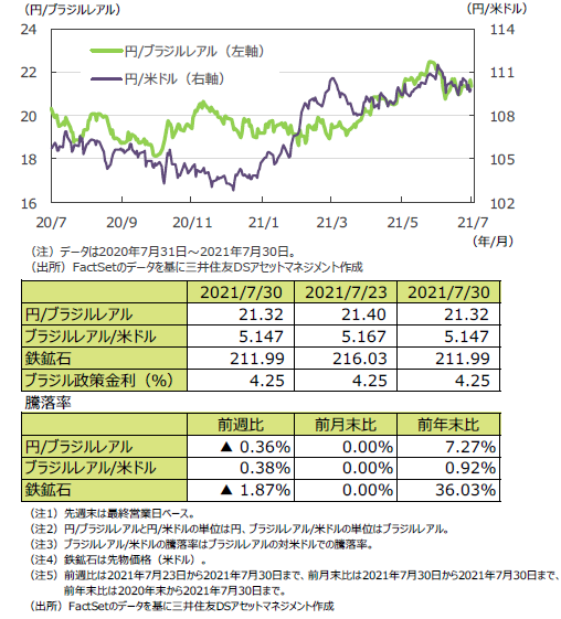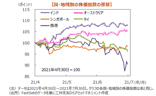 世界の主要株式市場は概ね下落しました。米国株式市場は、28日の米連邦公開市場委員会(FOMC)結果公表後のパウエル米連邦準備制度理事会(FRB)議長会見で緩和的金融政策の継続姿勢が示されたことなどは支援材料となりましたが、4~6月期の決算で一部のIT関連の主力株の決算や弱い見通しが嫌気されたことや新型コロナウイルスのデルタ型の感染拡大などが嫌気されました。NYダウは、週間では0.36%下落しました。日本株式市場は、4~6月期の決算は総じて良好でしたが、東京で新型コロナウイルスの新規感染者数が急増し、首都圏3県や大阪で緊急事態宣言が適用される方向となり軟調な展開となりました。週間では日経平均株価は0.96%下落しました。欧州株式市場は、独DAX指数は独4-6月期GDP速報値が予想を下回ったことなどが嫌気され、0.80%下落しました。英FTSE100指数は商品相場の堅調などを受けて0.07%上昇しました。中国株式市場は、中国当局がネット企業や教育産業への統制を強化したことが嫌気され上海総合指数は4.31%下落しました。香港ハンセン指数は4.98%下落しました。