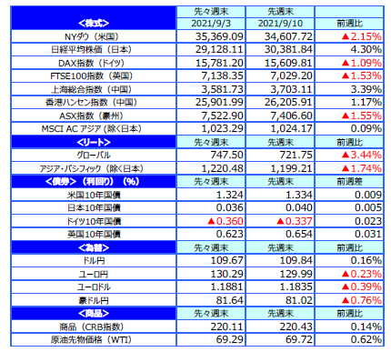 世界の主要株式市場は高安まちまちとなりました。米国株式市場は、前週末の8月雇用統計で非農業部門雇用者数が市場予想を下回り、景気回復ペースが鈍るとの懸念や、8月の生産者物価が市場予想を上回ったことなどが重しとなり、下落しました。NYダウは週間で2.15%下落しました。一方、日本株式市場は、自民党総裁選を控え、候補者による経済政策の発表で財政支出への期待が高まったことや、新型コロナウイルスの新規感染者数が減少していることを背景に、大幅に続伸しました。日経平均株価は約半年ぶりに終値で30,000円を回復し、週間では4.30%の大幅高となりました。欧州株式市場では、独DAX指数が1.09%、英FTSE100指数が1.53%の下落となりました。米株市場の下落や欧州中央銀行(ECB)の量的緩和の縮小(テーパリング)への警戒感、英国の増税計画などが嫌気されました。中国株式市場は、中国政府の景気支援策への期待などから続伸しました。中国本土市場の上海総合指数は3.39%、香港ハンセン指数は1.17%上昇しました。