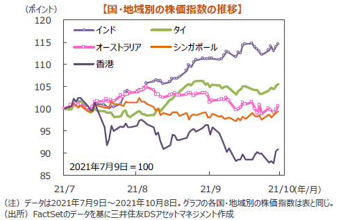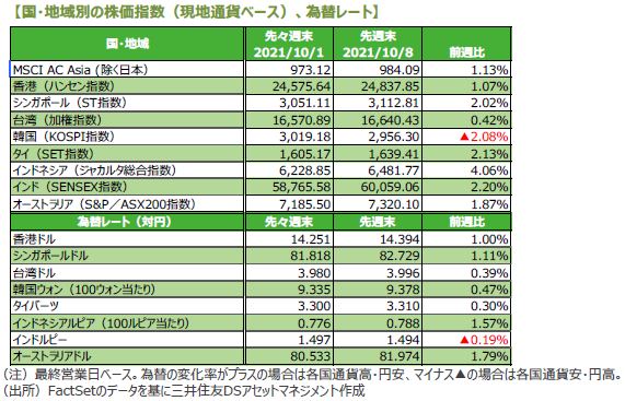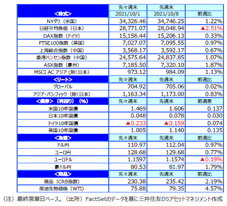 世界の主要株式市場は、日本を除き概ね上昇しました。米国株式市場は、週初長期金利の上昇が嫌気されてハイテク株中心に下落して始まりましたが、それまで反対していた共和党が連邦債務上限の短期的な引上げに賛成する姿勢を示したことで、米国債のデフォルト懸念が後退したことを受けて反発しました。NYダウは週間で1.22%高となりました。一方、日本株式市場は、米長期金利の上昇や中国不動産大手の破綻懸念に加えて、岸田新政権による金融所得課税の見直しへの警戒感から、軟調な展開となりました。日経平均株価は、8営業日連続で下落するなか一時27,000円台半ばに下落しましたが、米株市場が反発したことを受けて、週末にかけてやや戻し、28,000円台を回復して2.51%安で終了しました。欧州株式市場は、米株市場の上昇を受けて、反発しました。独DAX指数は0.33%高、英FTSE100指数は0.97%高となりました。中国株式市場では、本土市場が国慶節の連休により1営業日のみの取引となるなか、海外市場の反発を受けて上海総合指数は0.67%高となりました。香港ハンセン指数は1.07%高となりました。