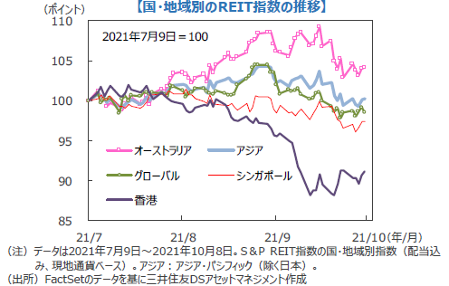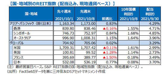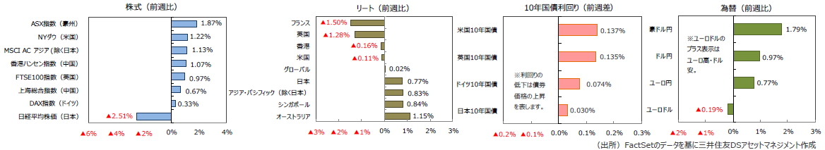 グローバル・リートは、株式市場が上昇する一方、長期金利が上昇したことを受けて、週間で0.02%高とほぼ横ばいでした。