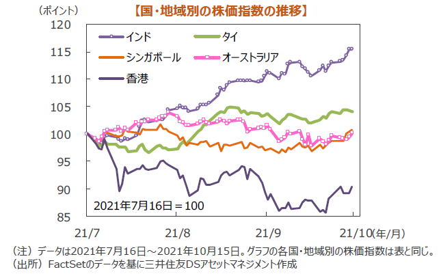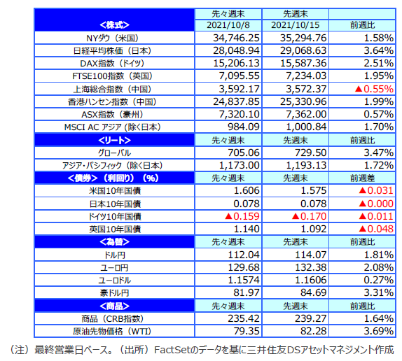 世界の主要株式市場は、概ね上昇しました。米国株式市場は、週初原油高によるインフレ懸念などから下落して始まりましたが、長期金利の低下を受けてハイテク株に買いが入ったことや、予想を上回る小売売上高が好感され、週後半に大きく反発し、週間で上昇しました。NYダウは1.58%高となりました。日本株式市場は、岸田新首相が金融所得課税の見直しについて当面は考えていないと発言したことを受けて買戻しが入り、週初から反発して始まりました。週後半は米国株式市場が大きく反発したことや、円安が進んだことで輸出関連企業を中心に買われ、大幅な上昇となりました。日経平均株価は、29,000円台を回復して3.64%高で終了しました。欧州株式市場は、米国株式市場の上昇や長期金利の低下を受けて上昇しました。独DAX指数は2.51%高、英FTSE100指数は1.95%高となりました。中国株式市場では、本土市場の上海総合指数が0.55%安となる一方、海外市場の上昇を受けて香港ハンセン指数は1.99%高となりました。