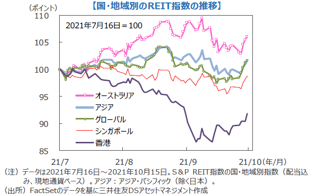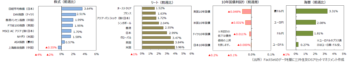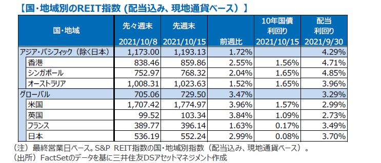 グローバル・リートは、株式市場が上昇したことや長期金利が低下したことを受けて、週間で3.47%高と大きく上昇しました。