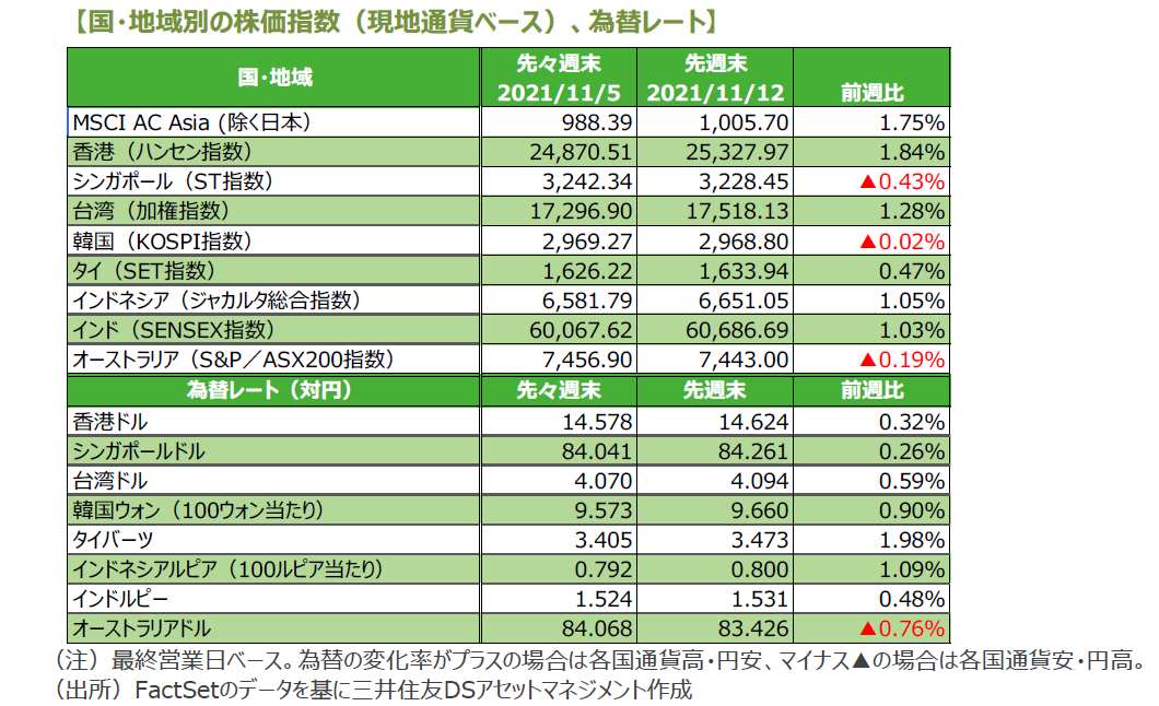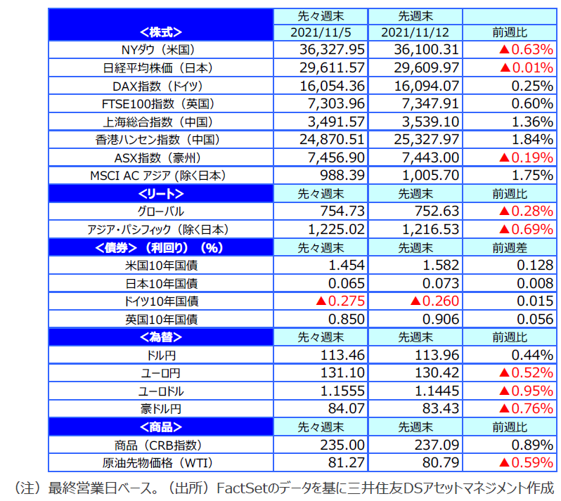 世界の主要株式市場は、高安まちまちとなりました。米国株式市場は、10月の生産者物価指数や消費者物価指数が大きく上昇したことでインフレ懸念が高まり、米金利が上昇したことを受けて、やや軟調な展開となりました。ただし、週末にかけては買い戻しが入り、下げ幅を縮小しました。NYダウは週間で0.63%安となりました。日本株式市場も、週前半は軟調な展開となりましたが、週後半に持ち直し、ほぼ横ばいで終了しました。日経平均株価は0.01%安で終了しました。一方、欧州株式市場は、好調な企業決算を背景に小幅に続伸しました。独DAX指数は0.25%高、英FTSE100指数は0.60%高となりました。中国株式市場は、6中全会の開催で様子見ムードが強まるなか、不動産業界への規制緩和の観測が浮上したことから上昇しました。中国本土市場の上海総合指数が1.36%高、香港ハンセン指数は1.84%高となりました。