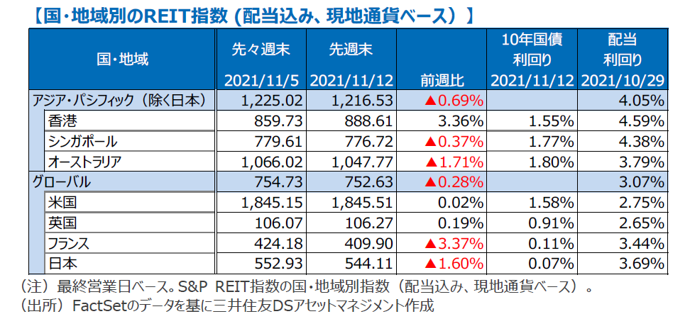 グローバル・リートは、長期金利の上昇を受けて、週間で0.28%安となりました。