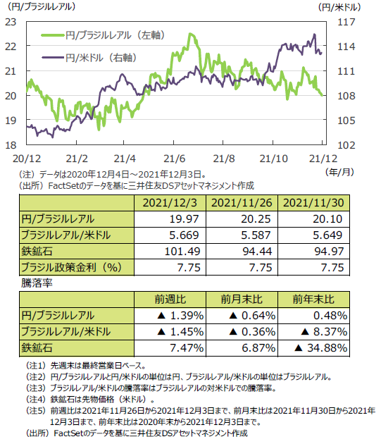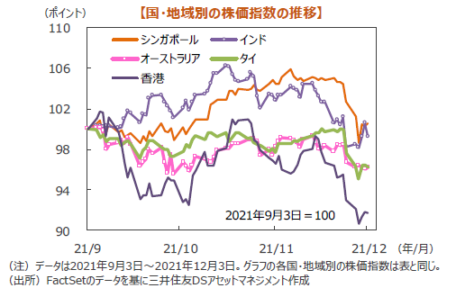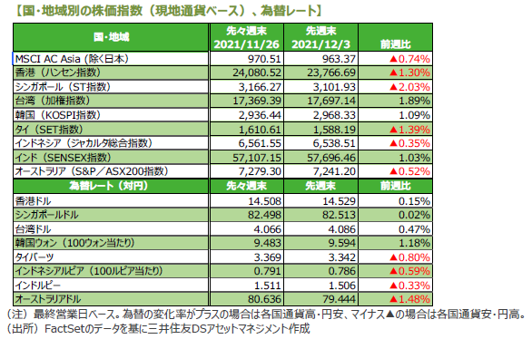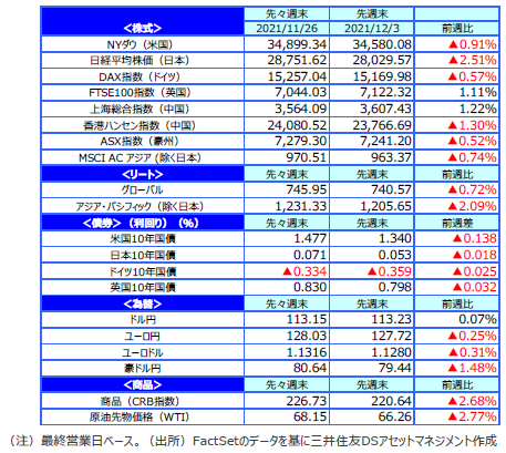 世界の主要株式市場は、高安まちまちとなりました。米国株式市場は、パウエル米連邦準備制度理事会(FRB)議長が量的緩和の段階的縮小(テーパリング)の加速の可能性を示唆したことや、米国で初めて新型コロナウイルスのオミクロン変異株(以下、オミクロン型)の感染者が発見され、感染拡大への警戒感が強まったことから軟調な展開となりました。NYダウは週間で0.91%安となりました。日本株式市場もオミクロン型への警戒感から弱含みの動きとなり、日経平均株価は2.51%安で終了しました。欧州株式市場は高安まちまちの動きとなりました。英FTSE100指数は、前週の急落の反動から買い戻しが優勢となり、1.11%高で終了した一方、オミクロン型への警戒感によるリスクオフ(回避)の動きが続き、独DAX指数が0.57%安となりました。また、中国株式市場では、中国政府による景気対策への期待から中国本土市場の上海総合指数が1.22%高と続伸した一方、リスクオフの動きから香港ハンセン指数は1.30%安と続落しました。