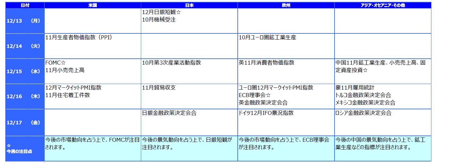 世界の主要株式市場は、軒並み上昇しました。米国株式市場は、米首席医療顧問が新型コロナウイルスのオミクロン変異株(以下、オミクロン型)の重症化リスクは高くないようだと発言したことや、11月の消費者物価指数が予想通りで金融引き締めへの警戒感が後退したことから投資家のリスク選好が強まり、大幅に上昇しました。NYダウは週間で4.02%高となりました。日本株式市場もオミクロン型への警戒感が和らいだことから反発しました。日経平均株価は週末にかけて伸び悩んだものの、1.46%高で終了しました。欧州株式市場は、オミクロン型への過度な警戒感が後退したことや米国株式市場が上昇したことを受けて上昇しました。英FTSE100指数は2.38%高、独DAX指数は2.99%高となりました。中国株式市場は、中国人民銀行が預金準備率を引き下げたことやオミクロン型への警戒感が和らいだことから上昇しました。中国本土市場の上海総合指数が1.63%高、香港ハンセン指数は0.96%高で終了しました。