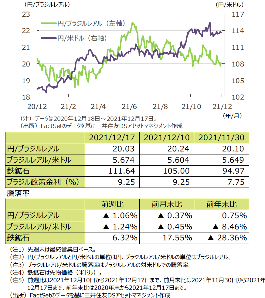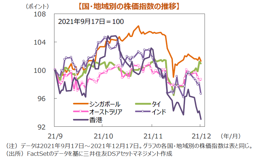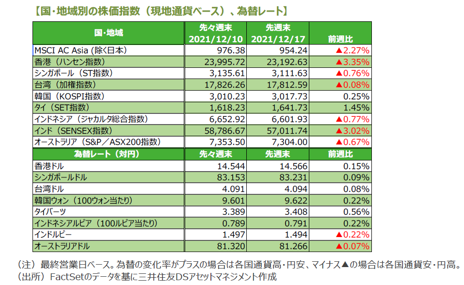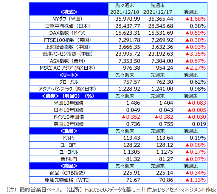 世界の主要株式市場は、概ね下落しました。注目された米連邦公開市場委員会(FOMC)では、量的緩和の縮小(テーパリング)の加速が決定され、2022年の利上げ見通しを3回とするなどタカ派的な内容でした。米国株式市場は、FOMCの結果発表当日は材料出尽くし感から大きく反発したものの、その後早期利上げへの警戒感からハイテク株などが売られ、週間では下落しました。NYダウは1.68%安となりました。一方、日本株式市場は、FOMCを受けて米国株式市場が一時反発したことを好感して急上昇したことから、週間では小幅高となりました。日経平均株価は、0.38%高で終了しました。欧州株式市場は、新型コロナウイルスのオミクロン変異株(以下、オミクロン型)の感染拡大が重しとなり、弱含みました。英FTSE100指数は0.30%安、独DAX指数は0.59%安となりました。中国株式市場は、米国が人権侵害を理由に一部の中国企業への投資や輸出を禁じると発表したことを受けて下落しました。中国本土市場の上海総合指数は0.93%安、香港ハンセン指数は3.35%安で終了しました。
