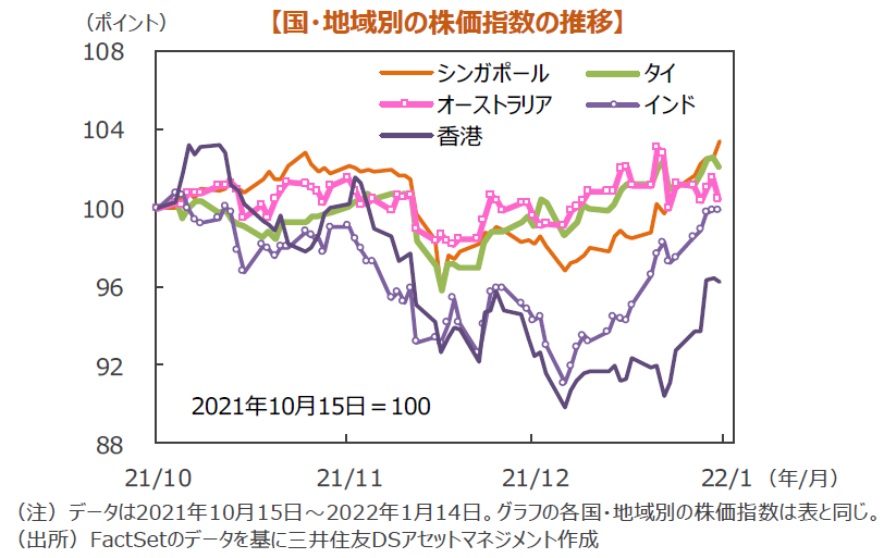 世界の主要株式市場は、高安まちまちとなりました。米国株式市場は、複数の連邦準備制度理事会(FRB)理事が利上げに積極的な姿勢を示すなど、FRB高官のタカ派発言が相次ぎ、金融政策の正常化が早まるとの見方が嫌気されて下落しました。NYダウは週間で0.88%安となりました。日本株式市場も、FRB理事の発言で一段と金融政策の正常化観測が高まるなか、米国株式市場が下落したことを受けて続落しました。日経平均株価は1.24%安で終了しました。欧州株式市場では、米国株式市場の下落を受けて独DAX指数が0.40%安となる一方、エネルギー株や金融株の上昇にけん引され、英FTSE100指数は0.77%高となりました。中国株式市場では、新型コロナウイルスの感染拡大に対する警戒感などから中国本土市場の上海総合指数が1.63%安となる一方、香港ハンセン指数は3.79%高で終了しました。
