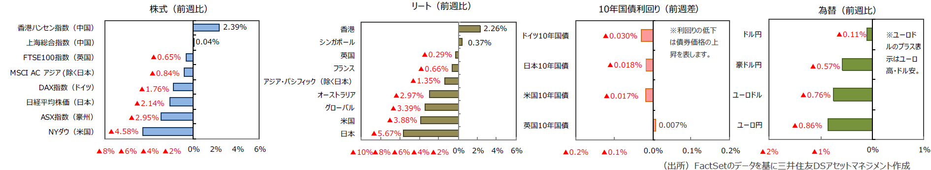 主要国の10年物国債利回り(長期金利)は、小幅に低下しました。米国の長期金利は、週前半にFRBによる早期引き締め観測から1.8%台に上昇しました。しかし、米国株式市場が大きく下落したことで、投資家がリスク回避姿勢を強めたことから相対的に安全資産とされる米国債に買いが入ったため1.7%台に戻り、週間では小幅低下となりました。ドイツの長期金利と日本の長期金利も小幅に低下しました。