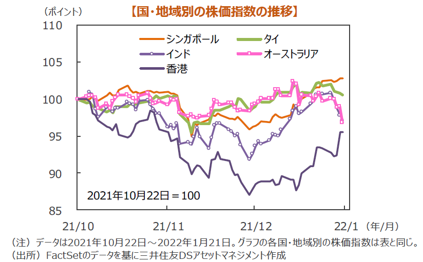 世界の主要株式市場は、中国市場などを除き概ね下落しました。米国株式市場は、連邦準備制度理事会(FRB)による早期金融引き締め観測からハイテク株を中心に幅広い銘柄が売られ、NYダウが週間で4.58%安となるなど、大幅に下落しました。ハイテク株主体のナスダック総合指数は、最高値からの下落率が10%を超え、調整局面入りしたとの見方から投資家心理が悪化したことで売りが膨らみ、一段安となりました。日本株式市場は週初上昇して始まりましたが、米国株式市場が大きく売られたことを受けて、下落しました。日経平均株価は2.14%安で終了しました。欧州株式市場も、米国株式市場の大幅安やウクライナ情勢をめぐる不透明感が嫌気され、下落しました。独DAX指数が1.76%安、英FTSE100指数は0.65%安となりました。一方、中国株式市場では、中国人民銀行が実質的な政策金利を引き下げたことから政府への政策期待が高まり、中国本土市場の上海総合指数が0.04%高、香港ハンセン指数は2.39%高で終了しました。