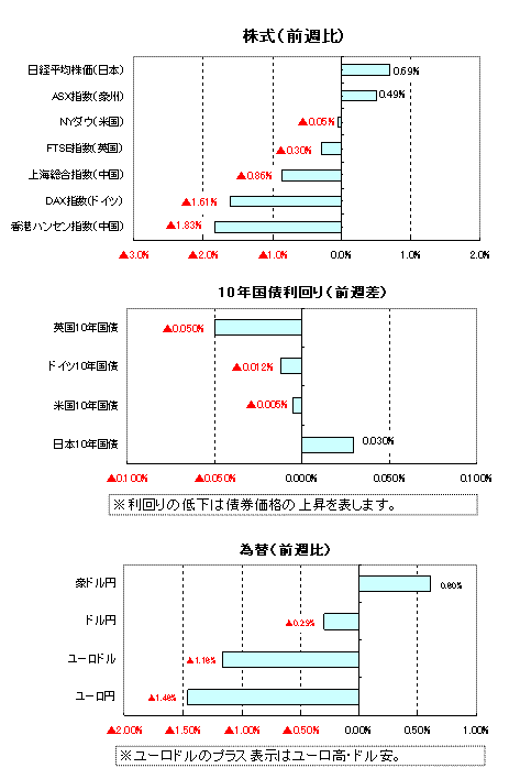 ドイツ国債は、債券価格が上昇(利回りは低下)しました。週を通じて債券価格は一進一退となりました。ユーロ圏経済の見通しが改善するなか、取引時間中には利回りが2%近くまで押し上げられる(債券が売られる)局面もありました。しかし、同水準付近での買いは根強く、前週末比では債券価格は上昇(利回りは低下)しました。