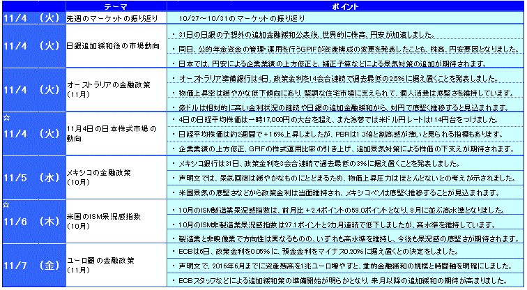米国株式は上昇しました。日銀の追加緩和や好調な企業決算などから、NYダウの週末終値は17,573.93ドルをつけ、最高値を更新しました。堅調な経済指標が多かったこと、中間選挙で共和党が上下院で過半数を獲得したこと、ECBの追加緩和期待が高まったことも追い風となりました。