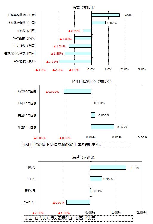 中国の株式市場は、減税などへの政策期待が強まり、上昇しました。日本の株式市場は、円がドルに対して下落したことが材料視され、上昇しました。