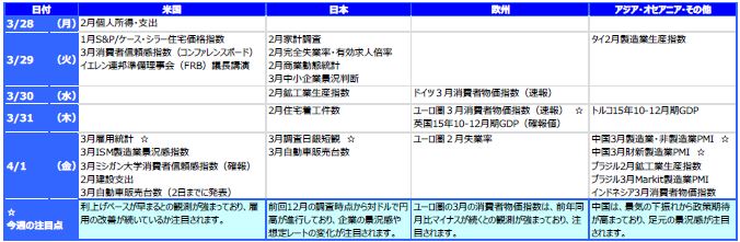 米国債の利回りは上昇しました。複数のFRB高官が早期利上げを示唆したことで、前週の利上げ時期の後退観測を背景とした国債利回り低下が巻き戻されたことが主な要因でした。ドイツ国債は、ブリュッセルで起きた連続爆破テロを受け、リスク回避の動きが強まり、利回りが低下しました。日本の10年国債の利回りは、▲0.1%前後でほぼ横ばいの動きでした。
