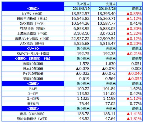ホームマーケット週次・月次市場情報先週のマーケットの振り返り(2016/8/22-8/26)【ウィークリー】/マーケット情報・レポート - 三井住友DSアセットマネジメント
