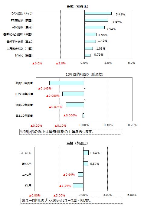 世界の株式市場は、軒並み上昇しました。米連邦公開市場委員会(FOMC)や日銀の金融政策決定会合で金融政策が示されたことで不透明感が後退し、投資家の買い安心感につながりました。米国株式市場では、米連邦準備理事会(FRB)の利上げペースが想定よりも緩やかになるとの期待からNYダウが最高値圏まで上昇しました。欧州株式市場のドイツDAX指数は週間で3.4%と、大きく反発しました。中国株式市場では、上海総合指数が薄商いのなかで上昇しました。日本の株式市場では、日銀の金融政策の枠組み変更を受けて、金融機関の収益悪化懸念が後退するとの見方から金融株に買いが入りました。日経平均株価は1.4%の上昇となりました。