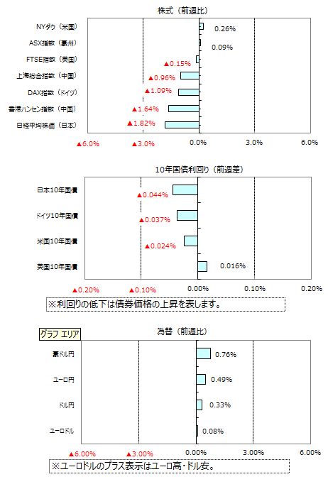 世界の株式市場は、高安まちまちとなりました。石油輸出国機構(OPEC)の減産合意を受け原油価格が上昇したものの、ドイツ銀行の経営難が欧州金融システム全般のリスクにつながるとの見方が強まり、投資家心理が悪化しました。米国株式市場では、NYダウが週間で小幅高となりました。欧州株式市場のドイツDAX指数は、ドイツ銀行を巡る問題が嫌気され、1.1%下落しました。中国株式市場では、上海総合指数が一時3,000ポイントを割り込むなど軟調に推移しました。日本の株式市場では、方向感の定まらない展開となるなか、ドイツ銀行の経営問題への警戒感などから売りが膨らみました。日経平均株価は週間で1.8%下落して終了しました。