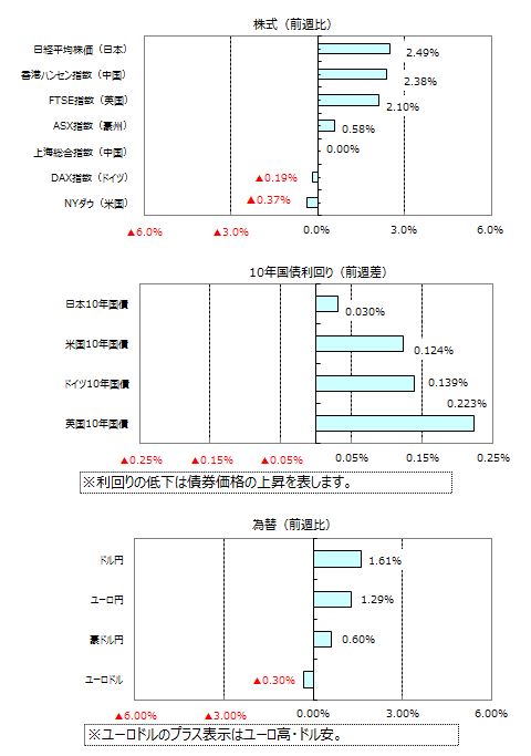 世界の株式市場は、高安まちまちとなりました。9月の米雇用統計は事前予想をやや下回る内容でしたが、米連邦準備制度理事会(FRB)が年内にも追加利上げに動くとの予想が多く、株式相場の重荷となりました。米国株式市場では、NYダウが週間で小幅安となりました。欧州株式市場のドイツDAX指数も、小幅下落して引けました。中国本土株式市場は、国慶節のため休場でした。日本の株式市場では、欧米の長期金利上昇で日本との金利差が拡大し、為替市場で円安が進んだことから、日経平均株価は2.5%の上昇で終了しました。