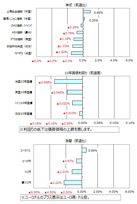 米国を中心に長期金利は低下しました。米国では、上述の通り、財政赤字拡大への懸念が一旦後退したことで、米連邦準備制度理事会(FRB)が利上げを急ぐ様子がないことが確認され、長期金利が低下した前週の流れが続きました。欧州や日本では、域内の材料に乏しい中で、米国債の影響を受ける形で長期金利は小幅ながら低下しました。