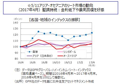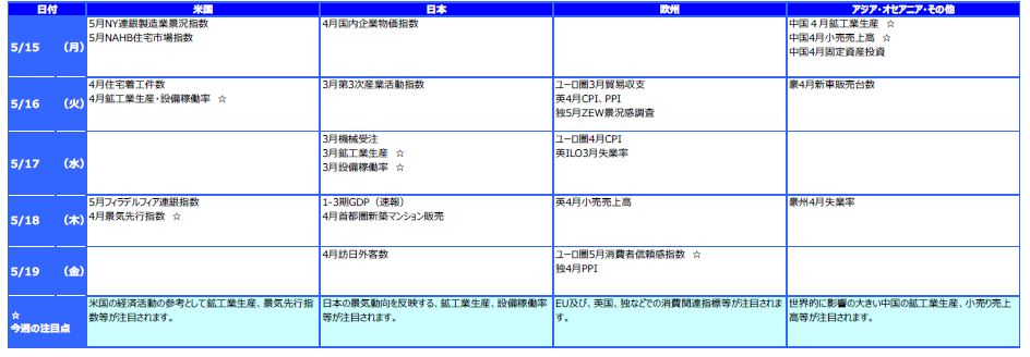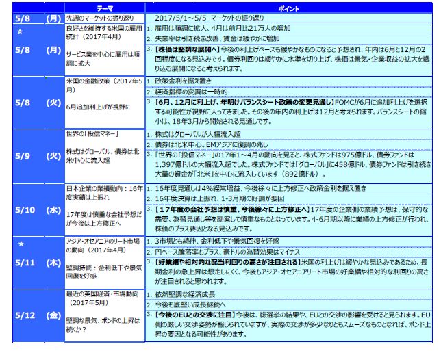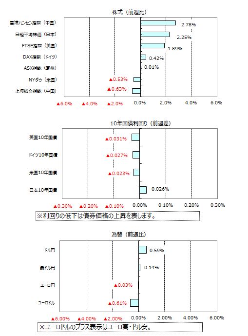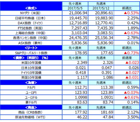 世界の株式市場は、フランス大統領選挙で中道系のマクロン大統領が勝利したことなどから、投資家のリスク取得意欲が高まり、日本、欧州などは上昇しました。米国株式市場は、企業決算はほぼ想定通りでもみ合いの展開が続き週間では小幅下落しました。日本株式市場は、フランス大統領選挙の2回目の投票結果を受けて、為替市場が大幅な円安基調となったことや、2018年3月期の増益期待が高まったことなどをを好感し、4週連続の上昇となりました。欧州株式市場は、フランス大統領選挙の2回目の投票の結果を受けて、マクロン大統領が勝利したことが好感され上昇しました。中国株式市場は、金融監督強化への懸念が強まり、小幅下落しました。
