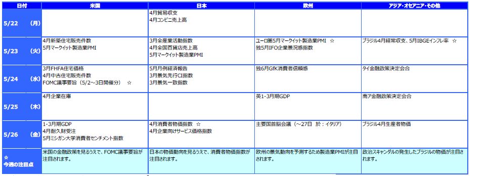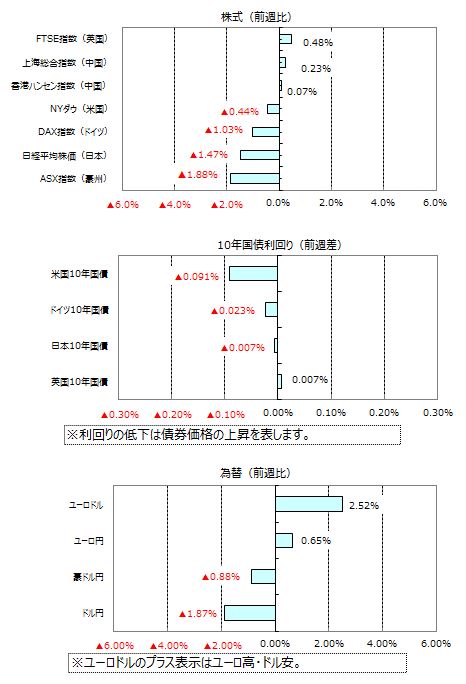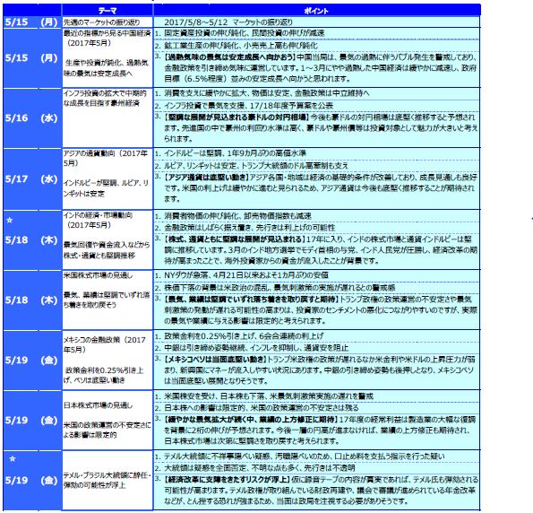 世界の株式市場は、高安まちまちとなりました。米国株式市場は、昨年の米大統領選挙戦中にトランプ氏とロシアが協調していた可能性を巡る捜査に関し、トランプ大統領が米連邦捜査局(FBI)長官を解任したことに端を発する「ロシアゲート」疑惑が一段と深まり、下落しました。欧州株式市場でも米政治リスクが嫌気され、ドイツDAX指数などが下落しました。日本株式市場では、米政治リスクの高まりに加え、ドル円相場が円高となったことから投資家のリスク回避姿勢が強まり、日経平均株価は5週ぶりに下落しました。一方、中国株式市場は、これまで調整局面が続いていたことから、6週ぶりに反発しました。