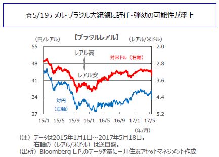 米国、ドイツ、日本の長期金利は低下しました。「ロシアゲート」疑惑などを受け米政権の政策運営の不確実性が強まり、投資家のリスク回避姿勢から安全資産とされる国債に資金が流入しました。米国の10年国債利回りは2.235%と、約1カ月ぶりの水準に低下しました。米国につられ、ドイツや日本の10年国債利回りも低下しました。