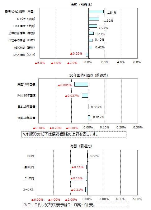 米国、長期金利は小幅上昇、欧州は低下、日本は横ばいとなりました。米国は「FOMC」議事要旨発表を前に週前半は金利が上昇しましたが、発表された議事録はハト派的ととらえられ金利は低下、週間では小幅上昇しました。日本の10年国債利回りも小幅上昇しました。英国は保守党の支持率が低下しているとの報道を受け、警戒感から金利は低下しました。